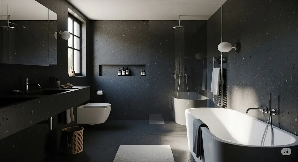 Tip 1: Brug den samme flise på både gulv og vægge. Dette trick “snyder” øjet ved at udviske overgangen mellem gulv og væg, hvilket får rummet til at virke større og mere sammenhængende.